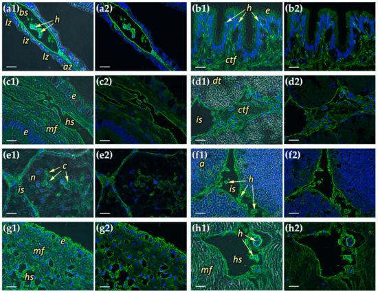 The MkC1qDC localization in organs of M. kurilensis: (a1,a2) gills; (b1,b2) mantle; (c1,c2) intestine; (d1,d2) digestive gland; (e1,e2) kidney; (f1,f2) gonad; (g1,g2) pericardium; (h1,h2) muscle; (a1–h1) fluorescence with phase contrast; (a2–h2) fluorescence only. Abfrontal zone: az; acinus: a; hemocytes: h; hemal sinuses/vessels: hs; intermediate zone: iz; bronchial sinus: bs; interstitial space: is; concretions: c; lateral zone: lz; muscle fibers: mf; nephrocytes: n; digestive tubule: dt; connective tissue fibers: ctf; epithelium: e. Scale bars: 20 µm.