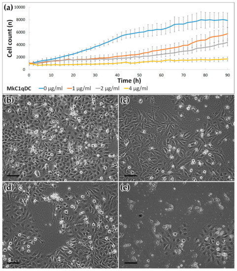 The MkC1qDC effect on HeLa cell line proliferation. Time-lapse cell monitoring and dynamic count based on Cell iQ machine learning during 90 h MkC1qDC treatment (a); the HeLa cell cultures after 90 h cultivation with MkC1qDC concentrations 0 μg/mL (control, b), 1 μg/mL (c), 2 μg/mL (d) and 4 μg/mL (e). Scale bars: 50 µm.
