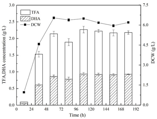 The PKU#SW8 strain was able to grow well between 16 °C and 36 °C and accumulate DHA (Figure 5d–e). Although the change in DHA concentration was not remarkable between 16 °C and 36 °C, the increase in the DCW between 24 °C and 28 °C was significantly greater than that between 16 °C and 24 °C. The maximum DCW (7.33 ± 0.12 g/L), concentration (0.84 ± 0.07 g/L) and yield of DHA (158.4 ± 7.8 mg/g) were attained at 36 °C, 28 °C, and 16 °C, respectively (Figure 5d–f).