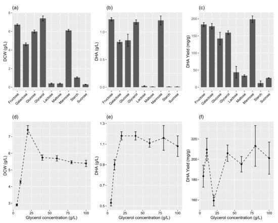Effects of various carbon sources (a–c) and glycerol concentrations (d–f) on DCW and the concentration and yield of DHA in the flask culture. (a–c) The concentration of individual carbon sources was 20 g/L. The data are expressed as mean ± SD of triplicate experiments.