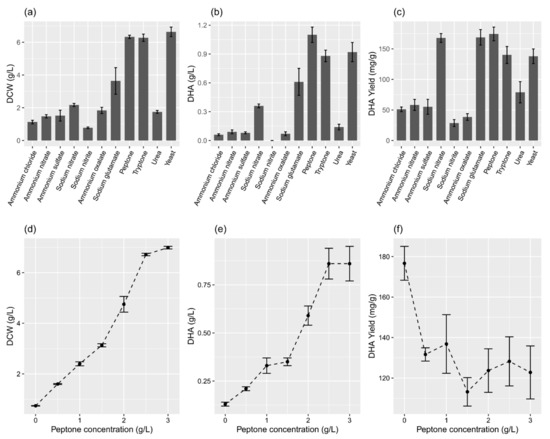 Effects of various nitrogen sources (a–c) and peptone concentrations (d–f) on DCW and the concentration and yield of DHA in the flask culture. (a–c) The concentration of individual nitrogen sources was 2.5 g/L. The data are expressed as mean ± SD of triplicate experiments.