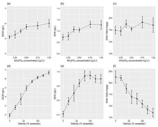 Effects of KH2PO4 (a–c) and salinity (d–f) levels on DCW and the concentration and yield of DHA in flask culture. The data are expressed as mean ± SD of triplicate experiments.
