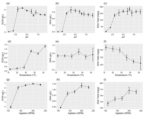 Effects of environmental variables on DCW and the concentration and yield of DHA in flask culture. (a–c) pH, (d–f) temperature, and (g–i) agitation speed. The data are expressed as mean ± SD of triplicate experiments.