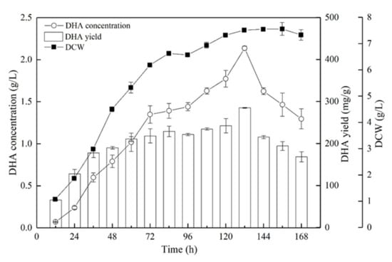 Time course of DCW and the concentration and yield of DHA during fermentation with optimal conditions in a 5-L fermenter. The data are expressed as mean ± SD of triplicate experiments.