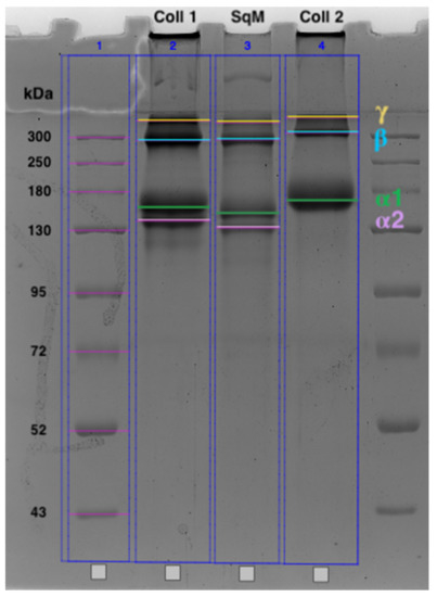 Evaluation of the GSCM collagen chains’ electrophoretic mobility in 8% PAAG under the denaturing and reducing conditions. Collagen Type I (Coll 1) and Type II (Coll 2) were used as collagen standards. SqM—collagen extracted from the GSCM. The high range protein ladder bands are shown in kDa.