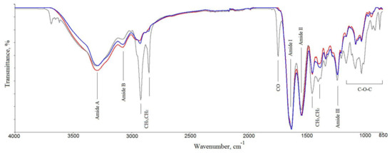 The position of the Amide I band in the GSCM spectrum is in agreement with the literature data on the Amide I band in the spectra of oligopeptides containing Gly, Pro, and Ala in various combinations, as well as the spectra of polyproline [60]. This is consistent with the results of the study of the amino acid composition, demonstrating that the main amino acids of the GSCM are Gly, Pro, Hyp, and Glu (see Section 2.1, Table 2).
