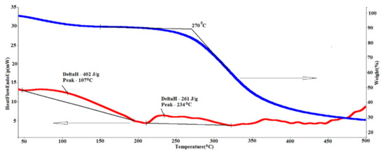 A typical weight loss vs. temperature curve (a thermogravimetric, TG curve), as well as a DSC curve, for the GSCM are displayed in Figure 3. In TG curves, there were two temperatures at which the onset of the thermal degradation occurred. The DSC curves showed two endothermic peaks. The broad endothermic peak in DSC curves in the temperature range of 50–170 °C is associated with thermal dehydration [62,63,64]. This process was accompanied by a ~10% weight loss (the TG curve). The broad and multimodal endothermic peak in the temperature range of 220–330 °C is assigned to the collagen matrix thermal denaturation and destruction. The latter process was accompanied by a ~65% weight loss (TG curves). According to [64], for dehydrated collagen type I, the endothermic peak of denaturation was observed at Tdn = 225 °C. It can be assumed that, below the temperature of Tdn ~225–235 °C, the interchain hydrogen bonds rupture, dehydrated collagens unfold, and amorphous polymers form. The second stage of destruction was observed at Tdst ˃ 235 °C. In general, the GSCM TG and DSC curves were similar to those for collagenous materials [62,64].