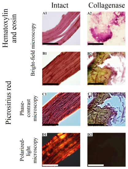 The histological study of the GSCM samples treated with collagenase showed signs of their destruction in the form of the loss of the typical structure, as well as changes in the tinctorial and optical properties of the laminar material (see Section 2.3, Figure 4(A2,B2,C2,D2)). These signs included homogenization with lysis and appearing basophilic (Figure 4(A2)) and picrinophilic regions (Figure 4(B2)), as well as loosening and loss of orientation of collagen fibers (Figure 4(C2)) with the disappeared anisotropy (Figure 4(D2)). At the same time, in the picrosirius red-stained samples, the remaining material represented a homogenic picrinophilic mass, in which few chaotically located destroyed collagen fibers were seen.