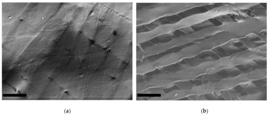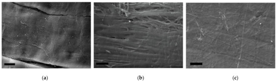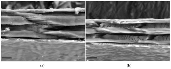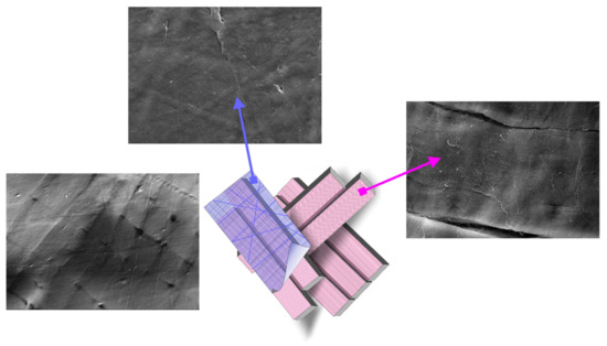 The SEM studies revealed that the GSCM surface had a multilayered basketweave structure, with laminae laid at different angles, which resembled a reinforcing mesh. The angle between the laminae was ~60–90° (Figure 5a,b).