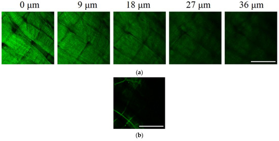 SHG images of the GSCM. (a) Collagen bundles in the form of laminae at different depths; (b) collagen in the form of cords at the sample’s surface (Scale bar = 100 µm). The SHG signal from collagen is marked by green.