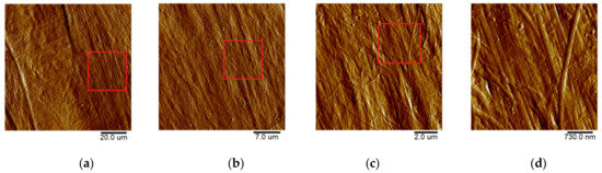 AFM topography of the GSCM with the sequential decrease of the scan size from the left to right image (increase of resolution): (a) 100 × 100 µm; (b) 30 × 30 µm; (c) 10 × 10 µm; (d) 3 × 3 µm. The samples’ topography is presented using the Peak Force Error for the better detail resolution.
