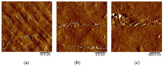 With a higher resolution (a 3 × 3 µm scan, see more on the Figure 11), one can see the characteristic striation of collagen fibrils (D-period). The D-period is equal to 67 nm, although the experimentally obtained values depend on the sample hydration [65].