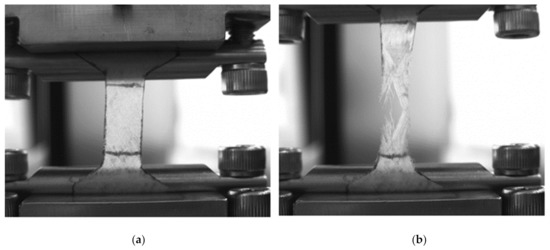 A uniaxial stretching test: (a)—start, (b)—end of test.
