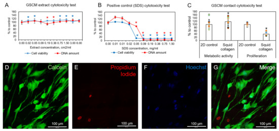 (A)—Elution test: AlamarBlue cytotoxicity assay and PicoGreen DNA assay of the GSCM extracts, 3 days of MSCs’ cultivation, 5000 cells per well. (B)—AlamarBlue cytotoxicity assay and PicoGreen DNA assay of SDS (positive control), 3 days of MSCs cultivation, 5000 cells per well. (C)—AlamarBlue contact cytotoxicity assay and PicoGreen DNA assay of cells adhered to culture plastic (2D control) or GSCM, 3 days of cell cultivation, 20,000 cells per well. * p < 0.05 relative to other groups. (D–G)—Live/Dead cell viability assay with nuclei staining (Hoechst, blue); live cells are stained with Calcein AM (green), and dead are stained with propidium iodide (red). At 7 days of cultivation, laser scanning confocal microscopy, scale bar is 100 μm.