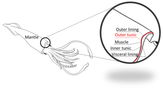 In the view of creating tissue engineered constructs with predefined mechanical properties, the mantle of squids attracts special attention, since these animals, living in the deep under great pressure, must have a robust musculature and outer coating to protect their internal organs. The morphological features of the squids’ mantle affect the mechanisms of their locomotion [46].