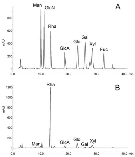 Chromatography of monosaccharide analysis. (A) Monosaccharide standards. (B) Rhamnan sulfate from the M. nitidum.