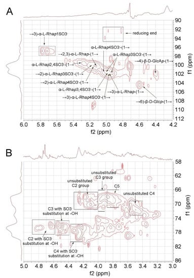 The elucidation of RS structure from 2D NMR was performed by cross-checking the signals of HSQC (Figure 3) and TOCSY spectra (Supplementary Data, Figure S1). The RS backbone mainly consists of →3)-α-L-Rhap-(1→, →2)-α-L-Rhap-(1→, and →2, 3)-α-L-Rhap-(1→units. The C4 hydroxyl groups of RS are largely sulfated, which can be concluded from the intense signal in the C2-C5 region of the HSQC spectrum (76–80 (f1)/4.2–4.4 (f2) ppm, Figure 3B). The non-reducing end of RS is heavily sulfated at C4 and/or C3 (Figure 3A). RS also contains rhamnose units that are sulfated at both C2 and C4 hydroxyl groups. The C1 of the reducing end was assigned at 92–94 ppm. However, the signal at 96–98 (f1)/5.6–5.8 (f2) ppm in HSQC suggests that some C1 hydroxyl group at the reducing end is sulfated. In addition, minor signals of →4)-β-D-GlcAp-(1→ and →6)-β-D-Glcp-(1→ were also assigned in the anomeric region.