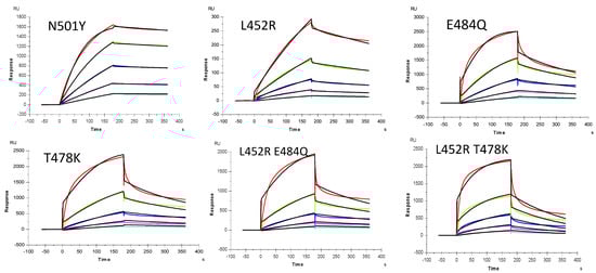 SPR sensorgrams of S-Protein RBD mutants’ interaction with heparin. Concentration of S-Protein mutants (from top to bottom): 1000, 500, 250, 125, and 63 nM, respectively. The black curves are the fitting curves using models from T200 Evaluate software.