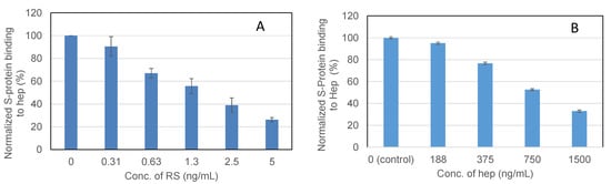 Solution competition between surface heparin and RS in buffer was performed using SPR [33]. In brief, S-Protein RBD (250 nM) and SARS-CoV-2 pseudoviral particles (10 times dilution with HBS-EP buffer) mixed with RS in HBS-EP buffer were injected over the heparin chip at a flow rate of 30 µL/min. Once the active binding sites on the protein molecules are occupied by RS in solution, the binding of S-Protein RBD/pseudoviral particles to the surface-immobilized heparin should decrease, resulting in a reduction of signal. After each run, dissociation and regeneration were performed as described above. For each set of competition experiments on SPR, a control experiment (protein only) was performed to ensure that the chip surface was completely regenerated and that the results obtained between runs were comparable. The same protein samples were also mixed with heparin in HBS-EP buffer and were tested to serve as a positive control.