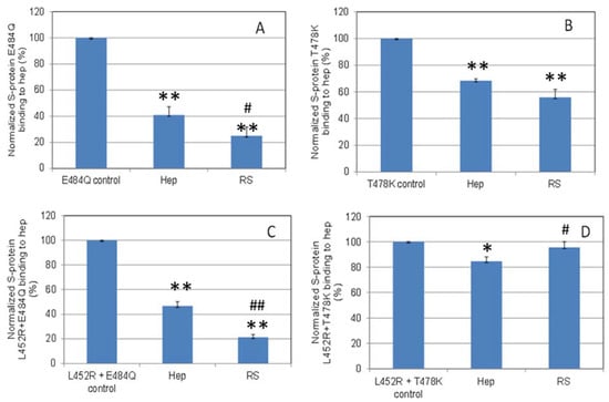 Bar graphs (based on triplicate experiments with standard deviation) of normalized S-protein mutants: (A) E484Q; (B) T478K; (C) L452R+E484Q; (D) L452R+T478K binding to surface heparin by inhibition with RS or heparin at concentration of 5 ng/mL in solution. Statistical analysis was performed using two-tailed Student’s t test to compare two different independent groups: * p < 0.05 compared to the control, ** p < 0.01 compared to the control; # p < 0.05 compared to the heparin, ## p < 0.01 compared to the heparin.
