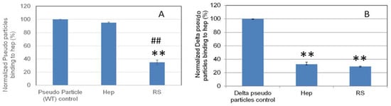 Bar graphs (based on triplicate experiments with standard deviation) of normalized pseudovirus particles binding to surface heparin by inhibition with RS or heparin. (A) Wild type pseudovirus particles inhibited by RS or heparin at concentration of 5 ng/mL in solution. (B) Delta variant pseudovirus particles inhibited by RS or heparin at concentration of 5 µg/mL in solution. Statistical analysis was performed using two-tailed Student’s t test to compare two different independent groups: ** p < 0.01 compared to the control; ## p < 0.01 compared to the heparin.