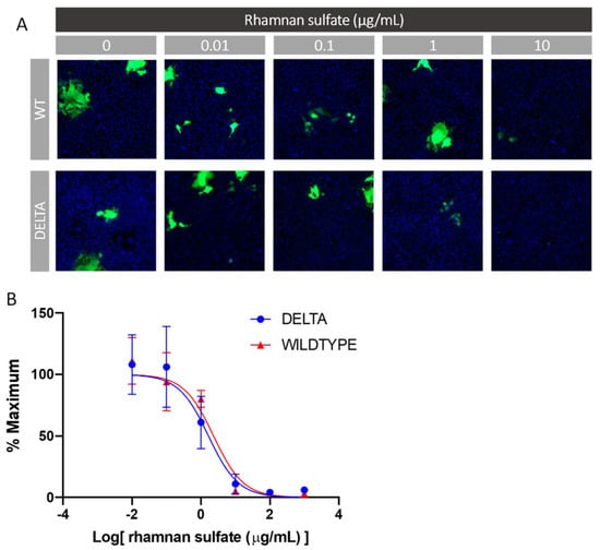 Glycans such as heparin have been shown to inhibit viral infection by interacting with the SARS-CoV-2 spike protein [26]. As such, we investigated the ability of RS to inhibit viral entry via a cell-based neutralization assay of SARS-CoV-2 pseudoviral particles. HEK293T cells that stably express the ACE-2 receptor (HEK293T-ACE2) were used. Six different concentrations were tested at a 1:10 viral dilution, thus enabling the determination of an IC50 value for viral inhibition based on the expression of EGFP as a marker for functional viral entry. Briefly, RS was incubated with pseudovirus particles for 1 h at 37 °C, after which the mixture was added to the HEK293T-ACE2 cells and incubated for 4 h. These incubation steps were performed under xeno-free conditions, as serum often contains growth factors that interact with polysaccharides and thus interfere with their interaction with the spike protein. After the 4 h incubation, there was a media exchange with serum to sustain cell growth for 48 h, after which the plates were assayed for expression of EGFP. The results of the neutralization experiment are shown in Figure 9. The y-axis represents the percentage of maximum infectivity that could be obtained for the experiment. For each concentration, the percentage of infected cells was normalized to the percent infected cells relative to the control (no RS and 1:10 viral dilution). As can be seen in Figure 9, the lowest dilution at an RS concentration of 1 μg/mL provided >80% viral entry inhibition for both the wild type and delta variant, thus leading to an IC50 value of 2.39 and 1.66 μg/mL, respectively.