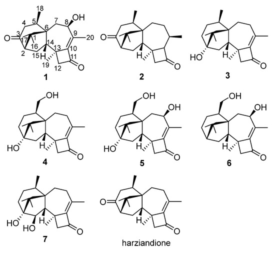 The following are available online at https://www.mdpi.com/article/10.3390/md19120689/s1, including detailed 1D and 2D NMR data, ECD calculations, HRESIMS spectra for compounds 1–7, as well as a brief summary of reported literatures about harziane type diterpenes from 1992 to 2021.