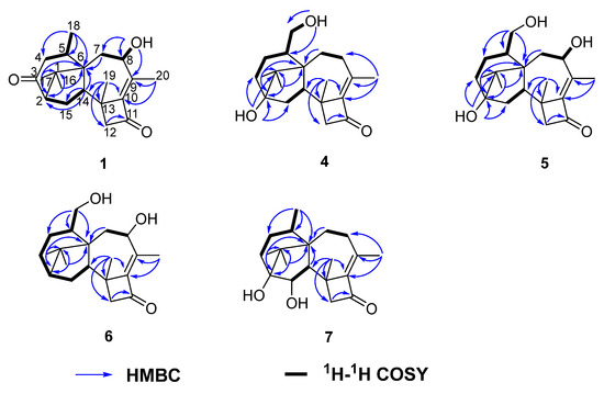 Key 2D NMR spectroscopy correlations of compounds 1 and 4–7.