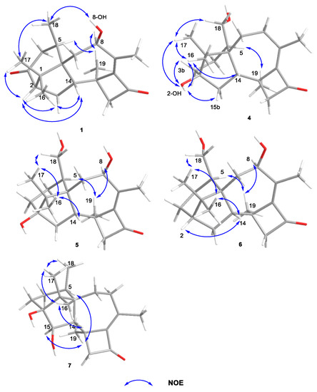 The relative configuration of 1 was determined by 1H-1H ROESY spectrum. The 1H-1H correlations—H-14 and H-2, H-14 and Me-16, H-5 and Me-19, Me-18 and 8-OH—indicated that H-2, H-14, Me-16, Me-17, and Me-18 were located on one side of the molecule, whereas Me-19 and H-5 were located on the opposite side (Figure 3).