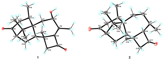 Compounds 2 and 3 were confirmed as known compounds, namely harzianol J [8] and harzianol A [13], by comparing their NMR spectroscopy data with those reported in the literature (Tables S2 and S3) [8]. Nevertheless, the absolute configuration of 2 was not determined previously. Herein we report it as 2S, 5R, 6R, 13S, and 14S by X-ray diffraction (Figure 5).