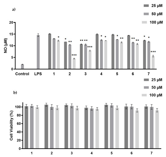 LPS-induced NO production (a), and viability (b) of RAW 264.7 macrophages by 1–7 treatment. The values represent the mean ± SEM of three independent experiments. *, p < 0.05; **, p < 0.01; ***, p < 0.001 vs. control.
