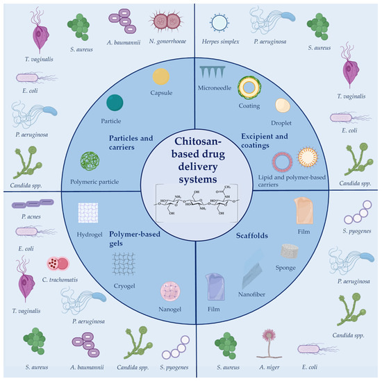 Chitosan-based delivery systems for the localized therapy of infections are summarized in Figure 1.