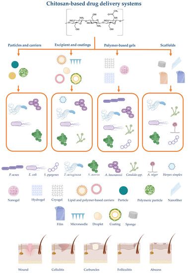 Summary of chitosan-based drug delivery systems and scaffolds intended for skin administration with their respective targeted microorganisms and examples of skin infections. The illustration is created with BioRender.com.