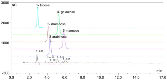 The monosaccharide composition of polysaccharides from L. japonica (LJP) detected by HPLC. The black line represents the chromatogram for LJP, and colored lines represent standards for corresponding monosaccharides. 1, fucose; 2, rhamnose; 3, arabinose; 4, galactose; 5, mannose.