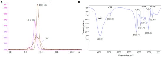 The molecular weight of LJP was about 200 kDa (Figure 2A). The polysaccharide contained carbohydrates (31.30%), ash (19.65%), proteins (4.51%), sulfate (13.70%) and moisture (9.53%). In a general view of the Fourier transform infrared (FT-IR) spectrum of LJP (Figure 2B), the peaks at 3431 cm−1 and 2927 cm−1 represented the stretching vibration of the O-H in the constituent sugar unit and C–H in the sugar ring, respectively [14]. In addition, polysaccharides presented intense absorption bands at 1621 cm−1 and 1414 cm−1, which were due to the asymmetrical (C=O) and symmetrical (C-O) stretching vibration of the carboxylate group [15]. The band at ~1257 cm−1 (S=O stretching) confirmed the presence of sulfate in LJP, and the absorption band at 820 cm−1 suggested a C–O–S stretching vibration of sulfate groups on galactoyranose residues [9].