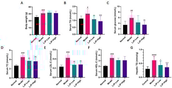 Polysaccharide of L. japonica (LJP) improved obese features of high-fat diet-fed mice. (A) Body weight. Serum (B) triacylglycerol (TG), (C) glucose, (D) total cholesterol (TC), (E) low-density lipoprotein cholesterol (LDL-C), (F) high-density lipoprotein cholesterol (HDL-C) and (G) hepatic TG. Data are shown as mean ± SD (n = 10); # p < 0.05, ## p < 0.01, ### p < 0.001, #### p < 0.0001 Model vs. Normal; * p < 0.05, ** p < 0.01, *** p < 0.001 vs. Model.