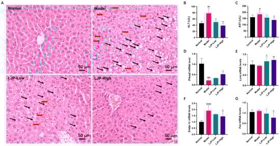 Polysaccharides of L. japonica (LJP) improved liver injury of high-fat diet-fed mice. (A) Liver sections was stained with haematoxylin and eosin. Black arrows indicate fat deposition in the forms of macrovesicular or microvesicular steatosis; red arrows indicate hepatocellular ballooning. (B) Alanine aminotransferase (ALT) and (C) aspartate aminotransferase (AST) in the serum. Hepatic mRNA levels of (D) Prkaa2, (E) Lxrα, (F) Srebp-1c and (G) Fas. Data are shown as mean ± SD (n = 10); # p < 0.05, ## p < 0.01, ### p < 0.001, #### p < 0.0001 Model vs. Normal; * p < 0.05, ** p < 0.01 vs. Model.