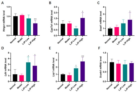 The effect of polysaccharides of L. japonica (LJP) on levels of cholesterol-regulating genes. Hepatic mRNA levels of (A) Hmgcr, (B) Cyp7a1, (C) Soat1, (D) Lrp1, (E) Ldlr and (F) Scarb1. Data are shown as mean ± SD (n = 10); * p < 0.05, *** p < 0.001 vs. Model.