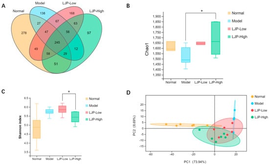 Polysaccharides of L. japonica (LJP) altered gut microbiota (GM) composition in high-fat diet-fed mice. (A) Venn diagram showing the distribution of operational taxonomic units (OTUs) among different groups. (B) Chao1 richness index of GM. (C) Shannon diversity index of GM. (D) PCA plot of microbial communities based on the OUT level. Data are shown as mean ± SD (n = 5 for Model and n = 6 for the other groups); * p < 0.05.