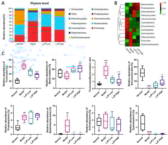 Polysaccharides of L. japonica (LJP) modulated gut microbiota (GM) composition at the phylum level in high-fat diet-fed mice. (A) Bacterial taxa relative abundance of all the groups at the phylum level. (B) Heat map of cluster stacking at the phylum level. (C) The relative abundances of Firmicutes, Bacteroidetes, and the ratio of Firmicutes to Bacteroidetes, Verrucomicrobia, Proteobacteria, Epsllonbacteraeota, Actinobacteria and Cyanobacteria. Data are expressed as mean ± SD (n = 5 for Model and n = 6 for the other groups). ## p < 0.01, #### p < 0.0001 Model vs. Normal; * p < 0.05, ** p < 0.01, *** p < 0.001, **** p < 0.0001 vs. Model.