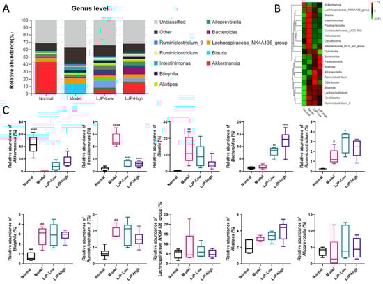 Polysaccharides of L. japonica (LJP) modulated gut microbiota (GM) composition at the genus level in high-fat diet-fed mice. (A) Bacterial taxa relative abundance of all the groups at the genus level. (B) Heat map of cluster stacking at the genus level. (C) The relative abundances of Akkermansia, Intestinimonas, Blautia, Bacteroides, Ruminiclostridium, Bilophila, Ruminiclostridum_9, Lachnospiraceae_NK4A136_group, Alistipes and Alloprevotella. Data are expressed as mean ± SD (n = 5 for Model and n = 6 for the other groups). # p < 0.05, ## p < 0.01, #### p < 0.0001 Model vs. Normal; * p < 0.05, ** p < 0.01, **** p < 0.0001 vs. Model.
