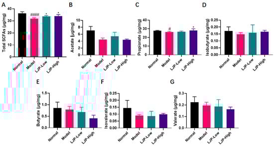 Short-chain fatty acids (SCFAs) are the main metabolic products of anaerobic bacterial fermentation in the intestine [17]. To investigate the influence of LJP on the metabolic activity of GM, the concentrations of six SCFAs (acetate, propionate, isobutyrate, butyrate, isovalerate and valerate) in cecal contents were detected with GC–MS, and the results were shown in Figure 9. In this trial, acetate, propionate and butyrate were found to predominate in all diet groups. Furthermore, total concentration of SCFAs was significantly reduced by HFD and recovered with LJP treatment. In detail, HFD lowered the concentration of propionate significantly. Administration of 5% LJP significantly restored the propionate concentration in HFD-fed mice. The content of the other five SCFAs showed no statistical differences. The inclusion of LJP in the HFD diet rebalanced these compounds.