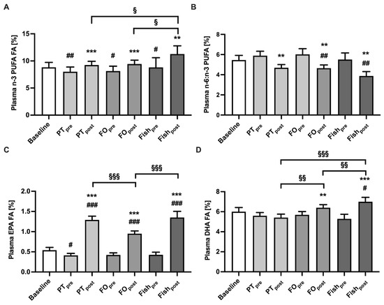 In order to determine the bioavailability of n-3 PUFA plasma fatty acids were measured for each intervention at baseline as well as pre- and post-intervention (Figure 2, and Supplementary Table S2). The n-3 PUFA plasma concentrations always decreased during the washout period from baseline to pre-intervention for all interventions (PT, p = 0.003; FO, p = 0.02; fish, p = 0.04), confirming that no n-3 PUFA was consumed at that time (Figure 2A). All n-3 PUFA-rich interventions increased plasma n-3 PUFA levels from pre- to post-intervention (PT, FO, p < 0.001; fish, p = 0.008), the increase being maximal after fish consumption (Fishpost compared to PTpost, p = 0.03; and Fishpost compared to FOpost, p = 0.03). The higher daily n-3 PUFA concentration of fish (554 mg/day) increased n-3 PUFA plasma concentrations from 8.8% to 11.3% (Δ2.5%) over two weeks. The increase was less pronounced for PT 8.0% to 9.25% (Δ1.24%) and FO 8.1% to 9.4% (Δ1.29%).