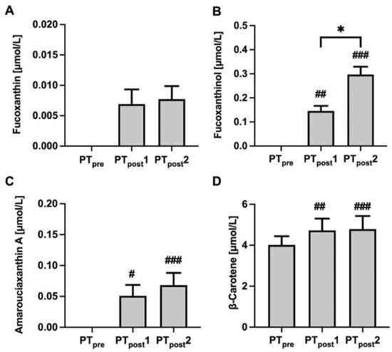 Plasma fucoxanthin (FX) and its metabolites as well as β-carotene concentrations before and after interventions with the microalgae Phaeodactylum tricornutum (PT). Plasma values of FX (A), fucoxanthinol (FXOH) (B), amarouciaxanthin (AxA) (C), and β-carotene (D) before intervention (PTpre) and one and two weeks after intervention (PTpost1, PTpost2) are shown as mean ± SEM from 22 participants. Statistics: # indicate difference to PTpre; * indicate difference between PTpost1 and PTpost2 */# p < 0.5, ## p < 0.01; ### p < 0.001.