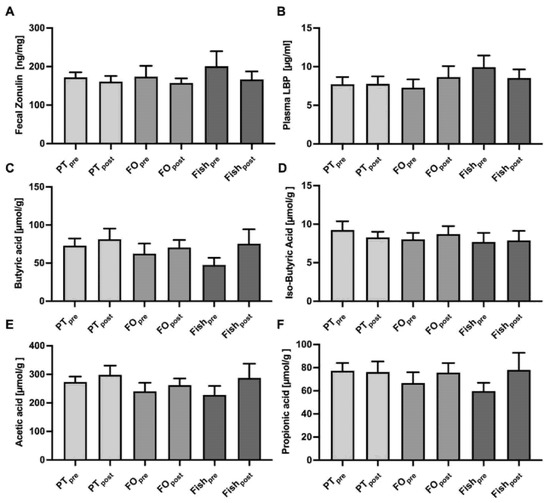 Assessment of gut barrier function and fecal short-chain fatty acid (SCFA) levels. Gut barrier function was analyzed by the validated biomarkers fecal zonulin (A), and plasma lipopolysaccharide-binding protein (LBP) (B). The SCFA butyric acid (C), iso-butyric acid (D), acetic acid (E), and propionic acid (F) were measured in feces before (“pre”) and after (“post”) intervention. Means ± SEM from 22 (PT, FO), or 9 (Fish) participants are shown. Abbreviations: see Figure 1.