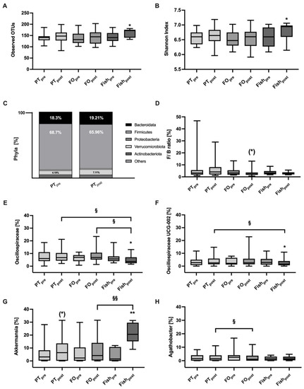 PT did not affect the gut microbiome. The α-diversity (Observed OTU, panel (A)) and the Shannon index (panel (B)) increase following the fish intervention. Relative bacterial abundancies at the phylum level (panel (C)) and the Firmicutes/Bacteroides (F/B) ratio (panel (D)) remained unchanged. Some changes of selected bacterial in family and genus level were found only after fish consumption (panel (E–H), see Supplementary Table S3). Data are shown as bar plots (panel (C)) or as box plots with median, 25% and 75% percentiles, min and max. * indicate differences to “pre”, § indicate differences between different interventions. (*) p = 0.1, */§ p < 0.05, **/§§ p < 0.01.