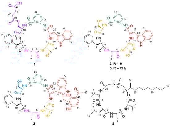 In our ongoing studies discovering structurally novel and bioactive natural hybrid peptides from soft coral-derived fungi [], three novel cyclic hexapeptides, sclerotides C–E (1–3) and a new lipodepsipeptide scopularide I (4), along with a known cyclic hexapeptide, sclerotide A (5) [], were obtained from Aspergillus sclerotiorum SCSIO 41031 (Figure 1). Herein we report the isolation, structure elucidation, and biological activities of these new cyclic peptides.