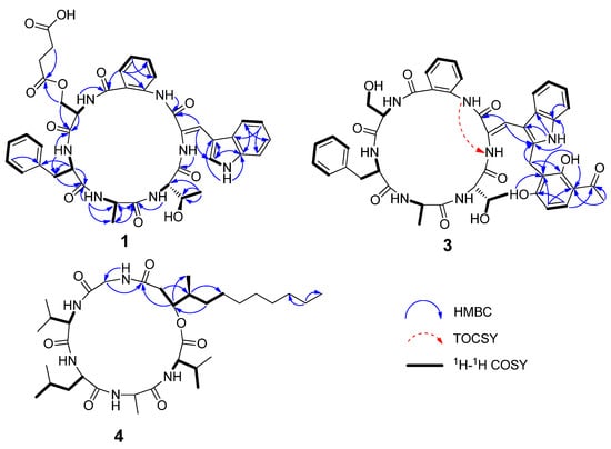 Key HMBC, 1H-1H COSY, and TOCSY correlations for 1, 3 and 4.