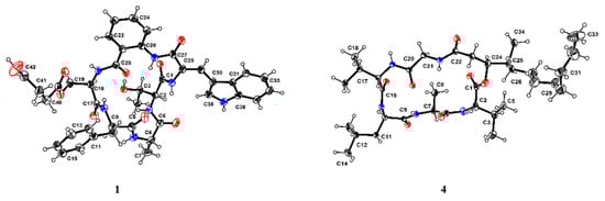Compound 1 was crystallized in a MeOH/H2O (10:1) mixture. The planar structure of 1 was further confirmed by X-ray diffraction analysis with Flack parameter 0.04(13) (Figure 3), and the unambiguous assignments of the absolute configuration as l-Thr, l-Ala, d-Phe, and d-Ser derivatives (BASE) were established. Thus, the structure of compound 1 was determined as cyclo (l-Thr-l-Ala-d-Phe-d-BASE-AA-Z-∆-Trp).