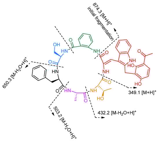 The connectivity between the residues of 3 was also established by the key HMBC correlations illustrated in Figure 2 and the ESIMS/MS spectrum (Figure 5). These results revealed that compound 3 consisted of cyclo (Thr-Ala-Phe-Ser-AA-ADPAT). Marfey’s method was employed to determine the absolute configurations of 3, which were assigned as l-Thr, l-Ala, d-Phe, and d-Ser. Thus, the structure of 3 was established as cyclo [l-Thr-l-Ala-d-Phe-d-Ser-AA-Z-ADPAT].